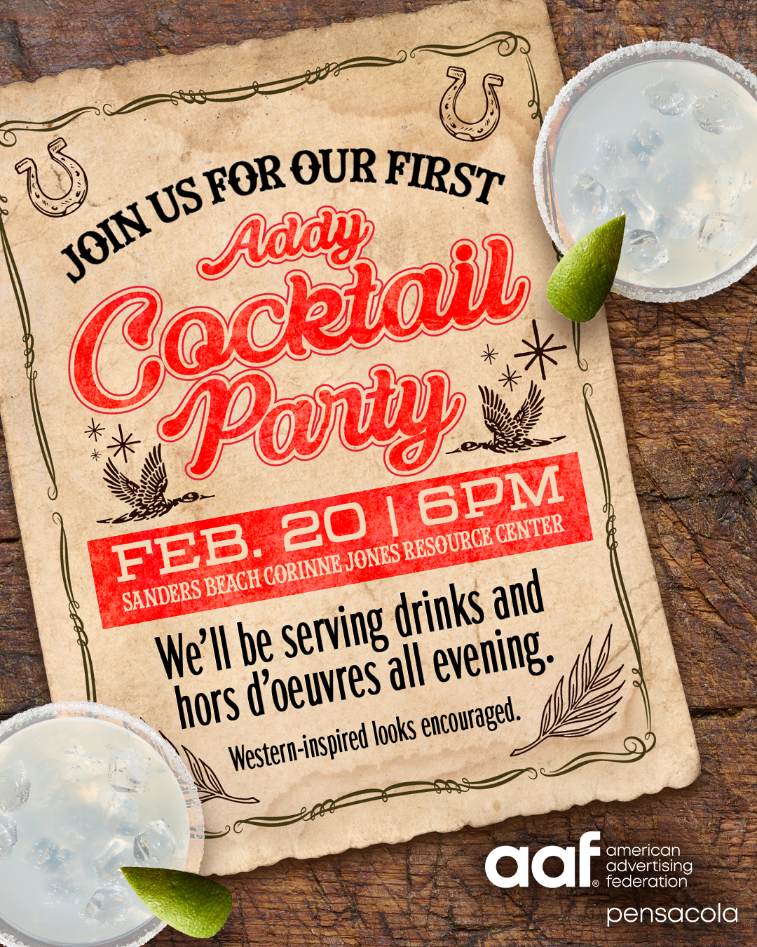 Get ready to kick up your boots and raise a glass! Join us for AAF Pensacola’s first-ever Addy Cocktail Party on February 20 at 6:00 PM at the beautiful Sanders Beach–Corinne Jones Resource Center.